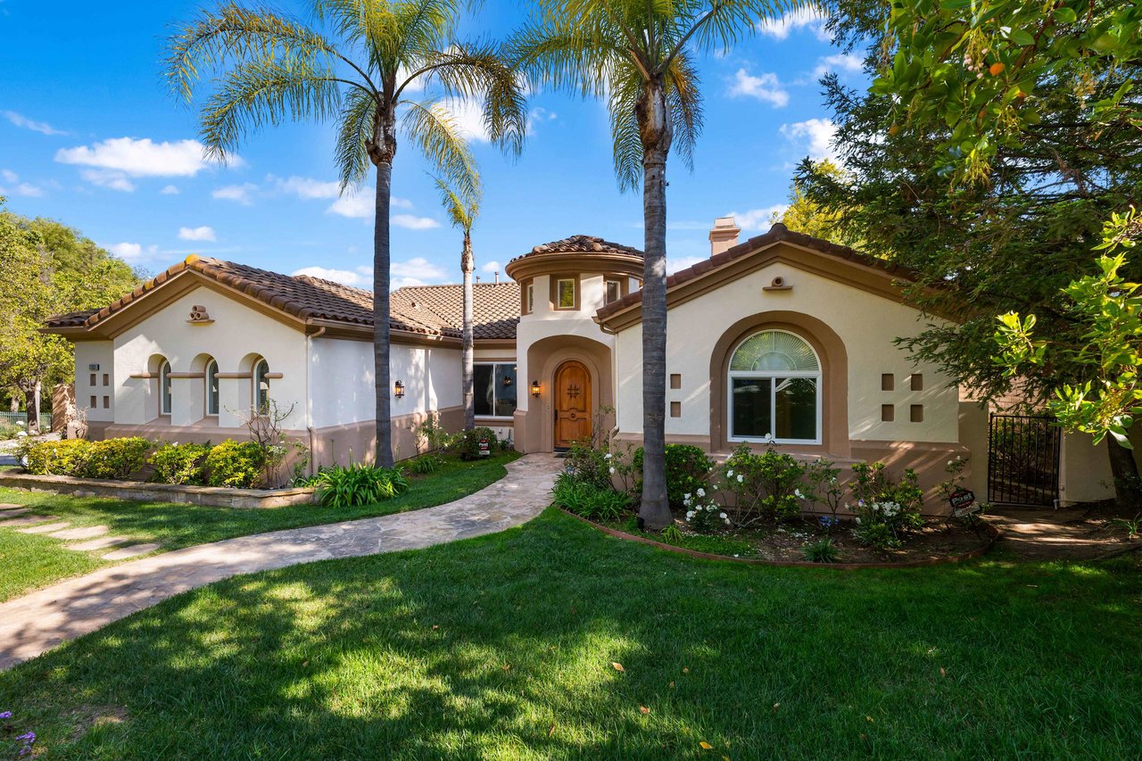 Introducing a stunning Spanish-style single-story home in the highly sought-after Solano Estate area of Camarillo, perfectly situated on a serene cul-de-sac. This luxurious property features four bedrooms and four bathrooms, spread across a spacious 3,741 square feet of refined living space. Step inside to discover a grand entrance that leads you into a beautifully updated interior, complete with new flooring and fresh paint throughout. The high ceilings enhance every room, creating an airy and inviting atmosphere. The heart of the home is the expansive kitchen, equipped with a large island, modern three-tone quartz countertops, and top-of-the-line stainless steel appliances, including a double oven. A butler's pantry adds to the kitchen's functionality, making entertaining a breeze. The living areas are just as impressive, with a formal dining room highlighted by an elegant chandelier and a double-sided fireplace that also warms the adjoining bonus room. The primary suite is a true retreat, featuring another cozy fireplace, breathtaking views, direct backyard access, and a luxurious ensuite bathroom with dual vanities and a large walk-in closet. Outside, the backyard oasis awaits with a stunning pool and picturesque views, creating the perfect setting for relaxation or hosting gatherings. Additional amenities include a large laundry room with ample storage, a three-car garage, and all-new windows that fill the home with natural light. Located near Rancho Campana High School and Mission Oaks Dog Park, this home offers both privacy and convenience. Ready to become your private haven, this property promises a blend of luxury, comfort, and style in the heart of Camarillo.